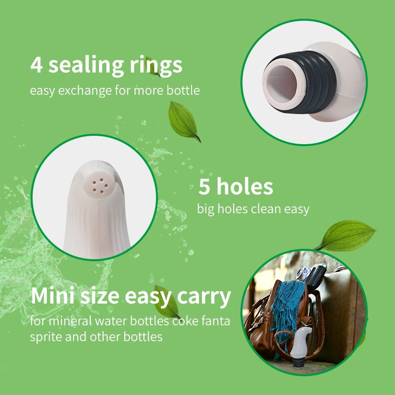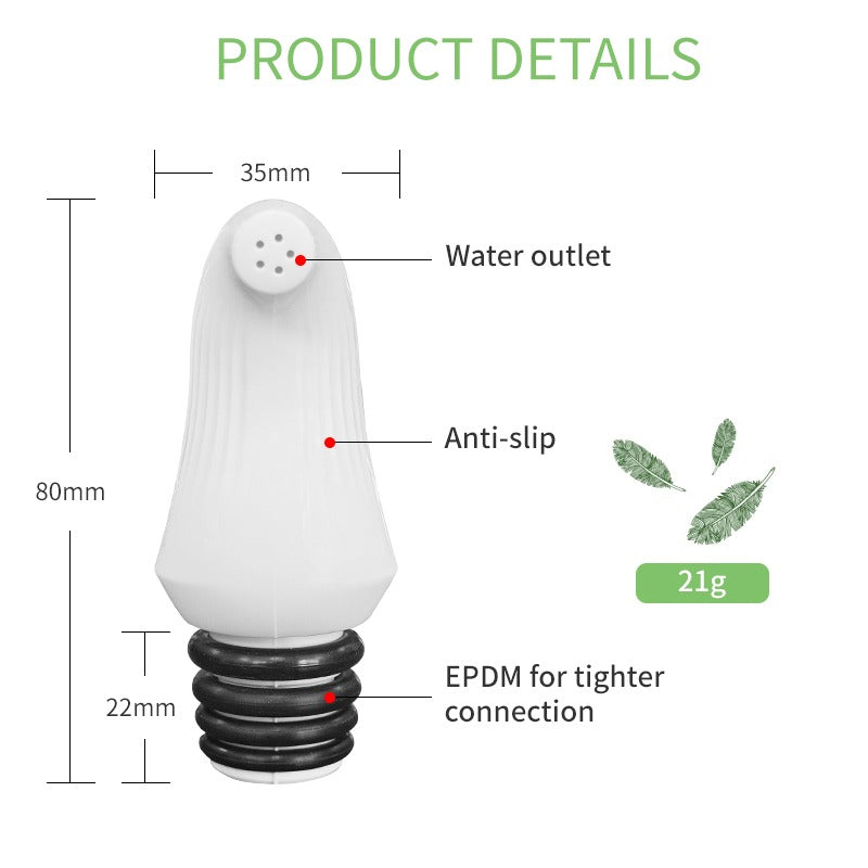 Keep clean on the go with this lightweight, easy-to-use nozzle that attaches to any screw cap plastic bottle. (Perfect for those long trips when you're responsible for your own water!) Simply plug in and go - no need to remove the cap until you're ready to use.