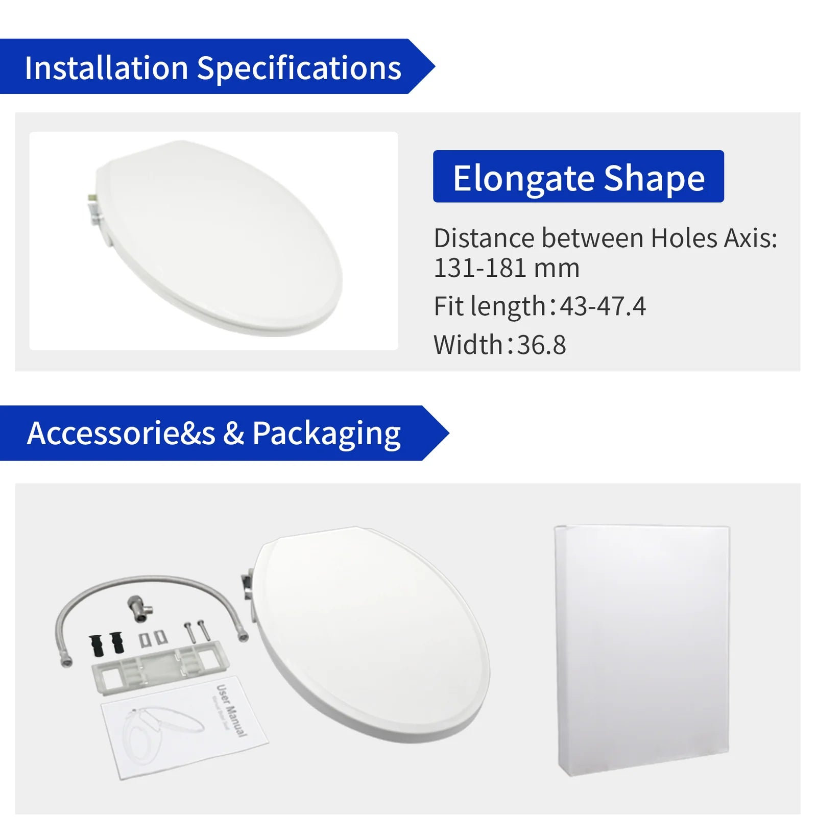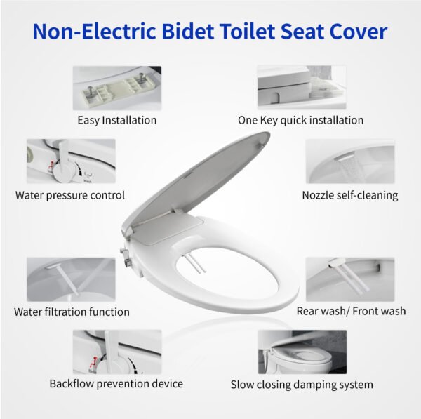 Great for bathrooms, offices, hotels, and short term rentals, this all in one elongated toilet seat. Built in controls for front and rear wash. No electricity needed.